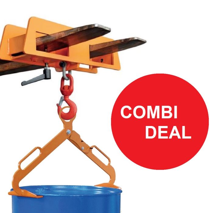 Lasthaak met vatenheffer voor gebruik met vorkheftruck, dubbele uitvoering voor 2 vorktanden, met draailasthaak en beveiligd tegen onbedoeld afglijden. Vatenheffer om gemakkelijk en veilig staande stalen 200 liter vaten te verplaatsen.