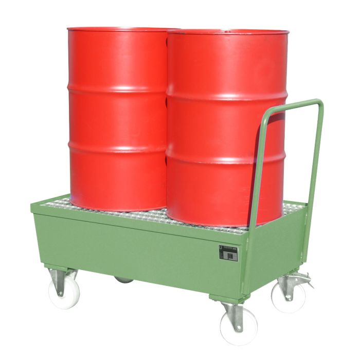 Verrijdbare lekbakken van staal met duwbeugel, met rooster. Met deze verrijdbare lekbakken bent u te allen tijde veilig mobiel aan het werk, in en rondom uw bedrijf. Deze verrijdbare stalen lekbakken zijn handig manouvreerbaar en van zeer degelijke kwaliteit.