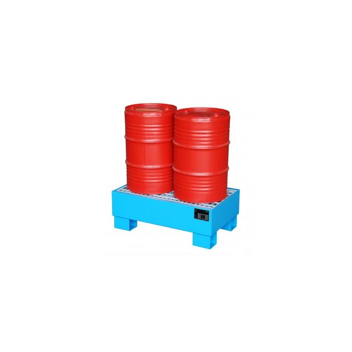 Stalen gelakte lekbak, met rooster voor 1 vat à 60 liter + klein emballage. Voor een veilige opslag van verpakte gevaarlijke stoffen overeenkomstig PGS 15 & VLAREM.