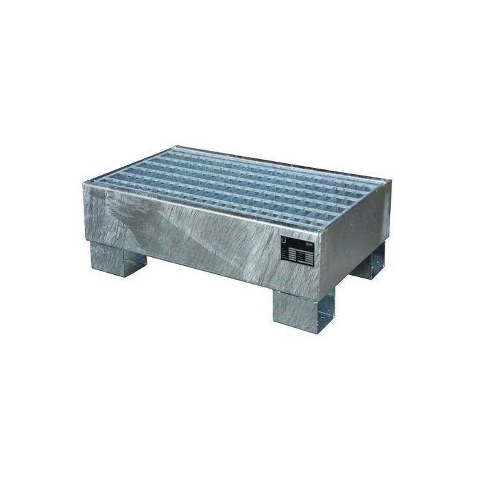 Stalen verzinkte lekbak, met rooster voor 3 vaten à 60 liter. Voor een veilige opslag van verpakte gevaarlijke stoffen overeenkomstig PGS 15 & VLAREM.