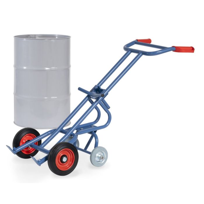 Gelaste stalen buis, gepoedercoat blauw RAL 5007, robuuste bovenlaagbescherming. Wielen van luchtbanden, naaf met rollager. Geschikt voor alle 200 liter vaten met rand. Met 2 steunwielen van massief streeploos rubber 160 x 40 mm.